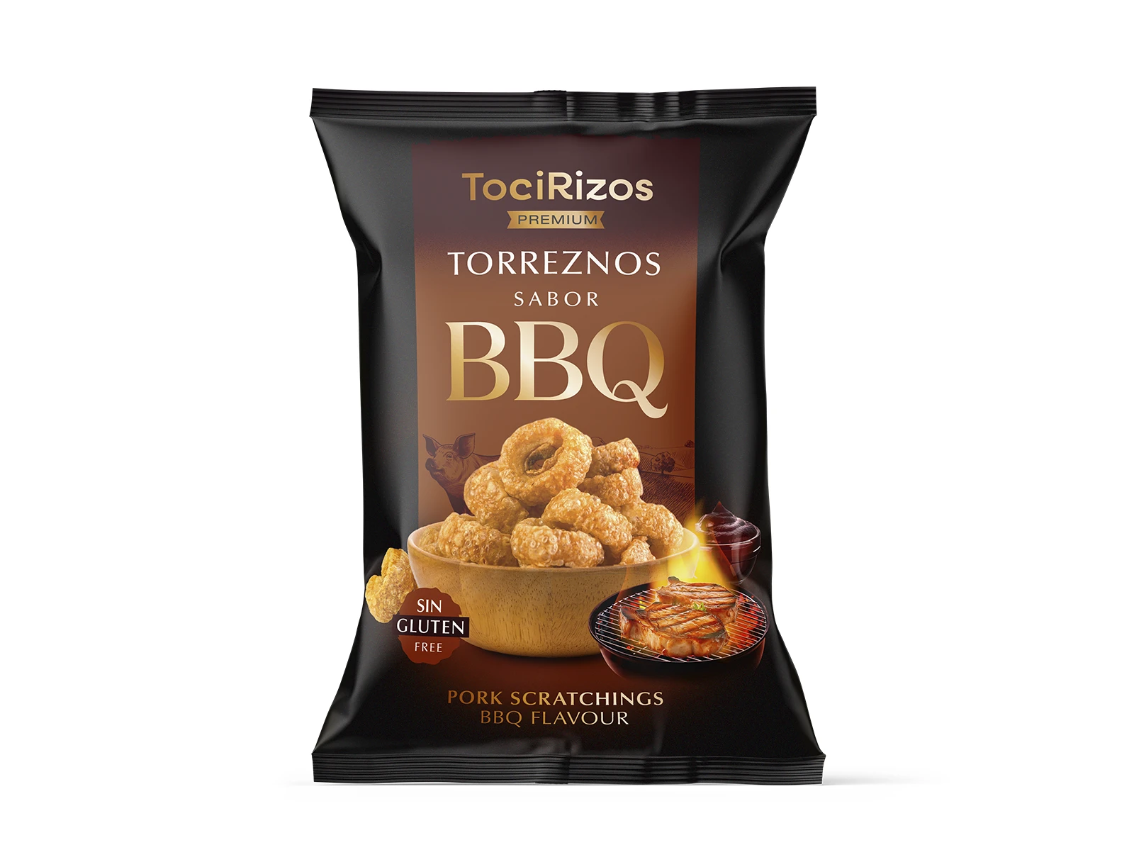 Crujientes torreznos de tocino de lomo de cerdo fritos en su propia grasa con aroma sabor barbacoa. Formato bolsa de 45gr y 100gr.