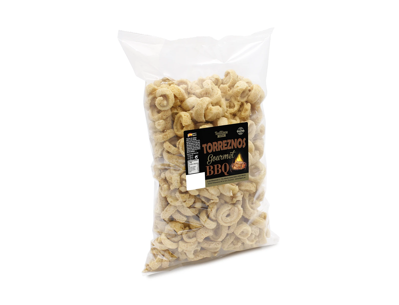 Crujientes Torreznos de tocino de lomo de cerdo salados, fritos en su propia grasa y con aroma sabor barbacoa. Ideal para degustar como aperitivo con una cerveza, vino o refresco.