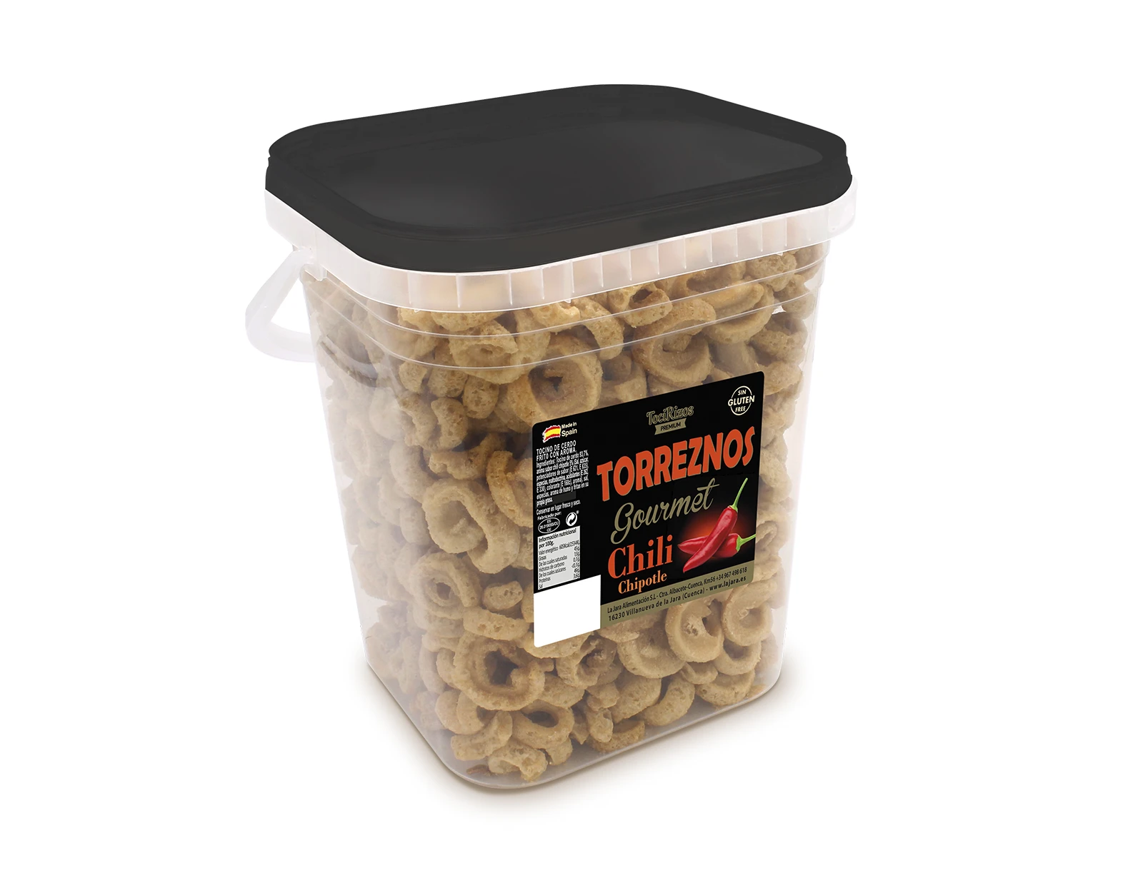 Crujientes torreznos de tocino de lomo de cerdo fritos en su propia grasa con aroma sabor Chili Chipotle. Ideal para degustar como aperitivo con una cerveza, vino o refresco.